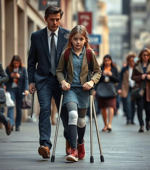 Лея решительно ступает вперёд. В этот момент из толпы вырывается высокий мужчина в дорогом пальто, с телефоном у уха и кожаной папкой под мышкой. Его локоть задевает один из костылей девочки. Равновесие нарушено. Костыль вылетает из рук Леи. Она чуть не падает… но удерживается. Лицо побледнело от испуга, губы плотно сжаты. А мужчина? Он даже не оборачивается. Уходит, как ни в чём не бывало.